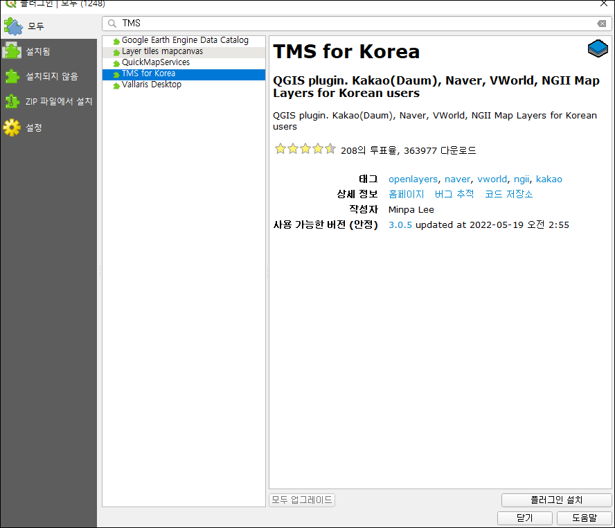 QGIS를 이용하여 지리정보를 사용하는 데 유익하게 사용하는 지도는 타일 맵입니다. 타일 맵을 사용하는 방법은 'TMS for Korea' 플러그인을 설치하여 활용합니다. 그중에서 가장 유익한 지도는 카카오맵입니다.