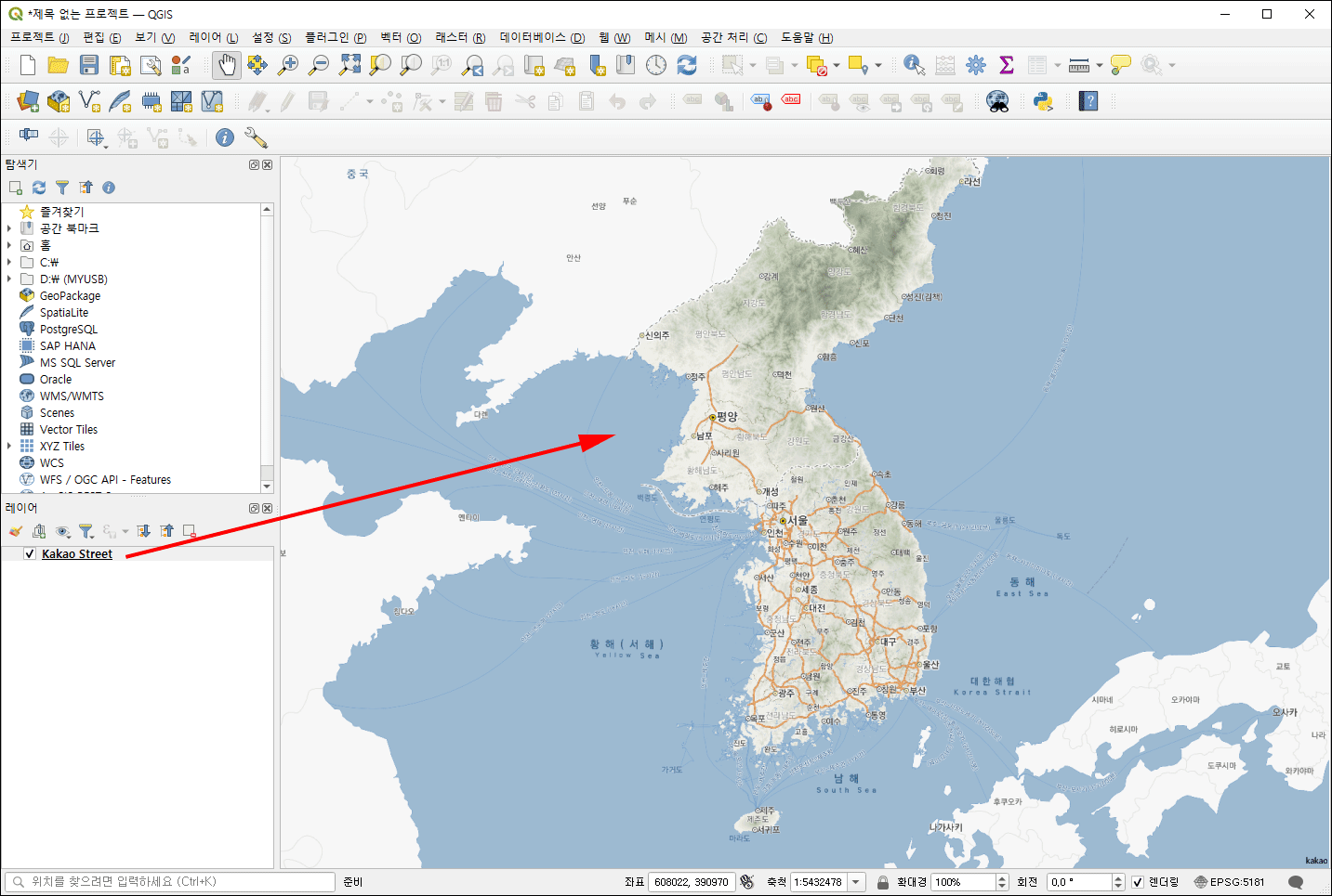 특히 학습에 필요한 대한민국 타일 맵은 카카오맵이 좋습니다. '카카오맵 스트리트'를 선택하면 다음과 같은 대한민국 지도가 작업창에 올라옵니다.