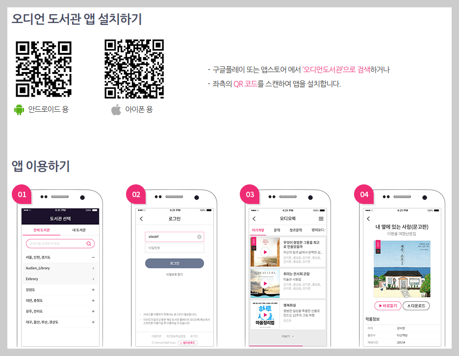 공공도서관에서는 기존 종이책과 전자책 외에 오디오북도 무료로 서비스합니다. 오디오북 특성에 따라 개별 앱을 설치하여 사용할 수 있습니다. '오디언 도서관'이 그 어플로서 설치 후에 사용 도서관을 선택합니다.
