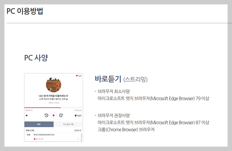 선택한 도서는 아래와 같은 방법으로 '플레이버튼' 혹은 '회차'를 클릭하여 재생하여 이용합니다. 재생되는 오디오북은 내 짐작에는 저자가 직접 녹음을 하지 않았나 싶습니다.