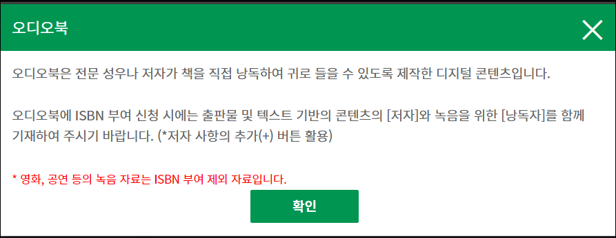 오디오북은 성우나 저자가 책을 낭독하여 귀로 들을 수 있게 편찬하는 콘텐츠입니다. '낭독자'를 함께 기재하라는 딸림 창이 떠서 필수항목임을 주지합니다.