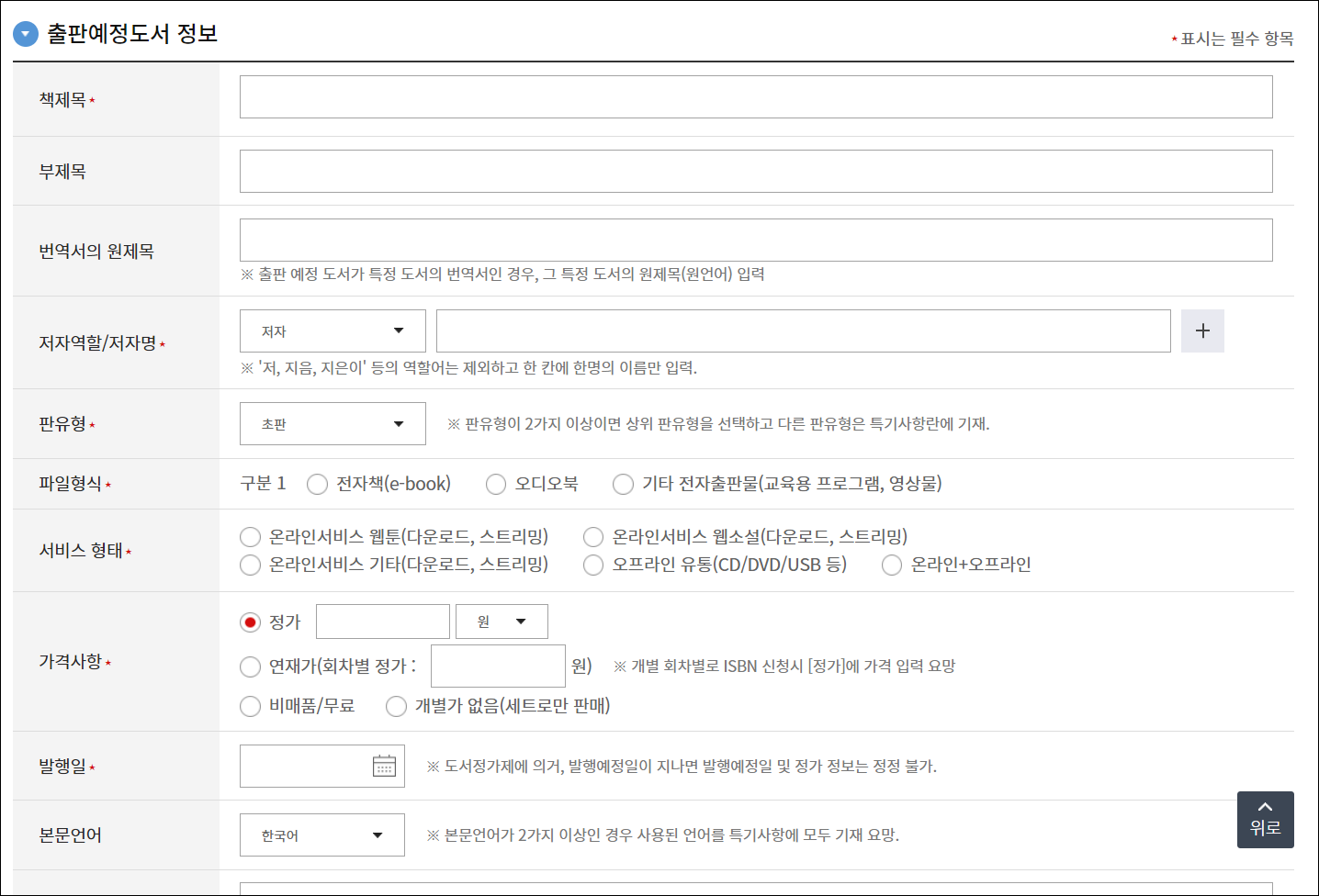 종이책 발행과 마찬가지로 ISBN 발행 서식도 동일합니다. 필수 항목과 선택 항목이 있고, 필수 항목은 빠뜨리면 안됩니다. 서지 등록을 하기 전에 책에 대한 개요나 표지 등을 미리 준비해두면 등록이 편합니다.