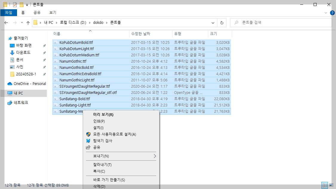 폰트에 설치되는 시간이 아주 짧다. 위와같이 선택해서 마우스 우클릭으로 나오는 팝업 메뉴에서 '설치'를 선택하면 순식간에 설치된다. 폰트 설치라는 것은 위 폰트 파일이 윈도즈 폰트 디렉터리에 복사되는 것이다.