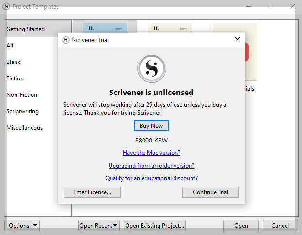 이어지는 설치는 스크리브너(Scrivener)이다. 스크리브너는 글을 쓰는데 도움을 주는 유익한 프로그램인데 유료 버전이다. 내 형편이 유료 버전을 사용하기는 버겁다. 트라이얼 버전을 사용하는데, 한계는 기한이 있다는 점이다. 그러나 고맙게도 도서관의 컴퓨터는 매일 리셋이 되기 때문에 항상 깨끗하게 트라이얼 버전을 사용할 수 있다. 물론 데이터는 GitHub에 곱게 저장되어 있으니 내려받아 활용하면 된다. 끝내고는 다시 클라우드로 업로드해서 관리한다.