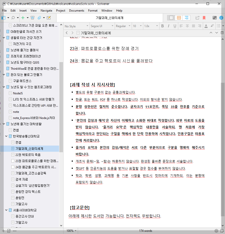 작업 파일을 열었다. 올 한해의 작업 물량이 왼편 목록으로 출력되고 최근 과제들이 보인다. 방송통신대 기말시험이 다가오기 때문에 기말고사 준비를 한다.
