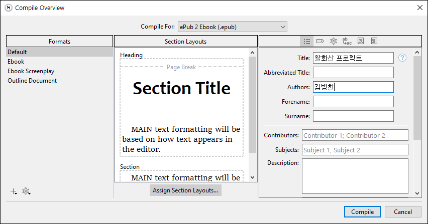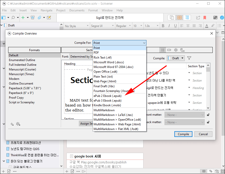 - 컴파일 창이 열리면, 좌측 상단의 'Compile For' 드롭다운 메뉴에서 'EPUB 2 Ebook (.epub)' 또는 'EPUB 3 Ebook (.epub)'을 선택합니다.