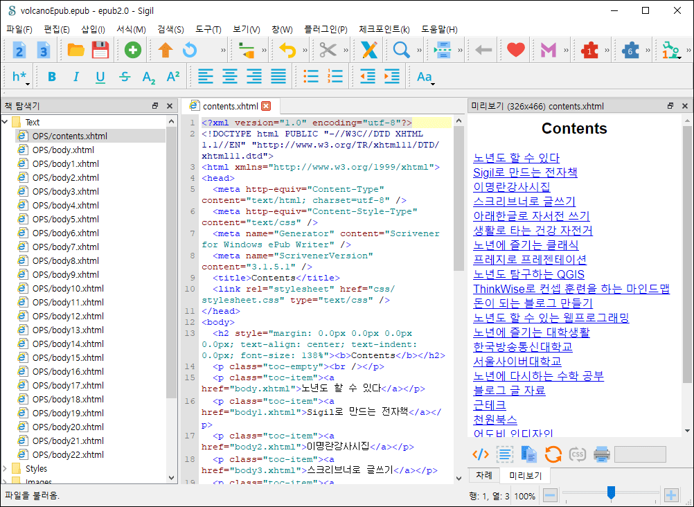 - EPUB 파일 열기: Scrivener에서 생성한 EPUB 파일을 Sigil에서 엽니다.