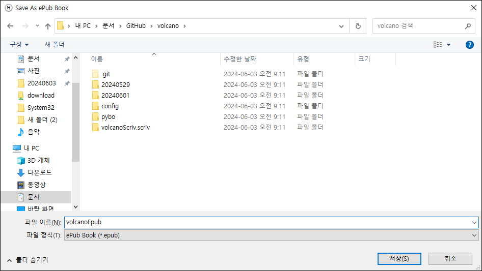 - 파일 이름과 저장 위치를 지정하고, 저장을 클릭하면 EPUB 파일이 생성됩니다.