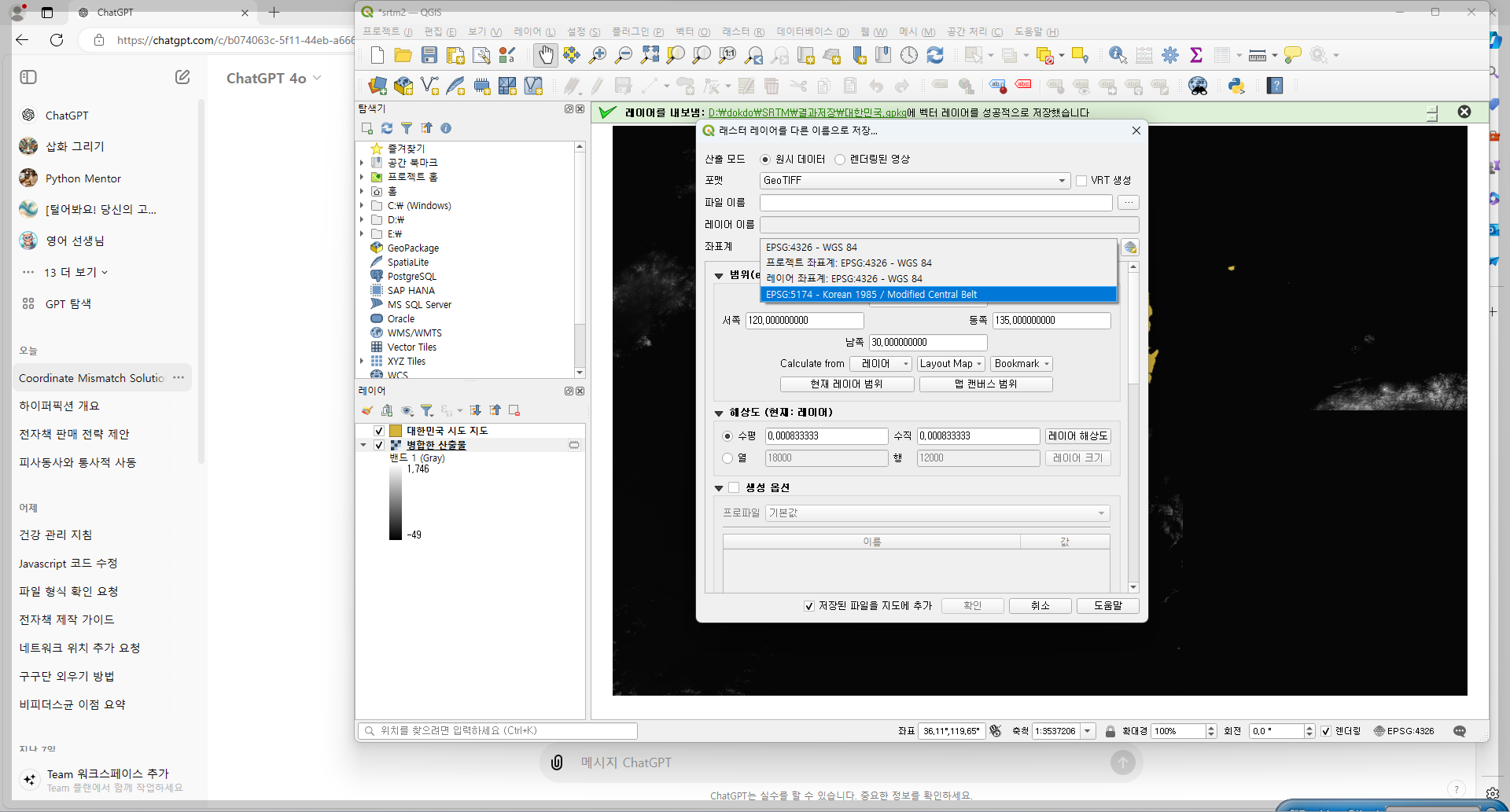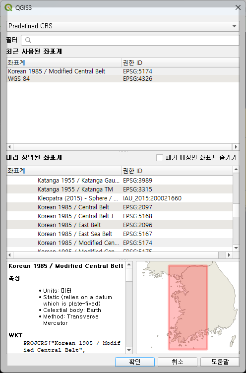 를 선택합니다. - 저장 형식을 선택하고, 좌표계 옵션에서 일치시킬 좌표계를 선택합니다. (예: EPSG:4326 또는 EPSG:3857 등)