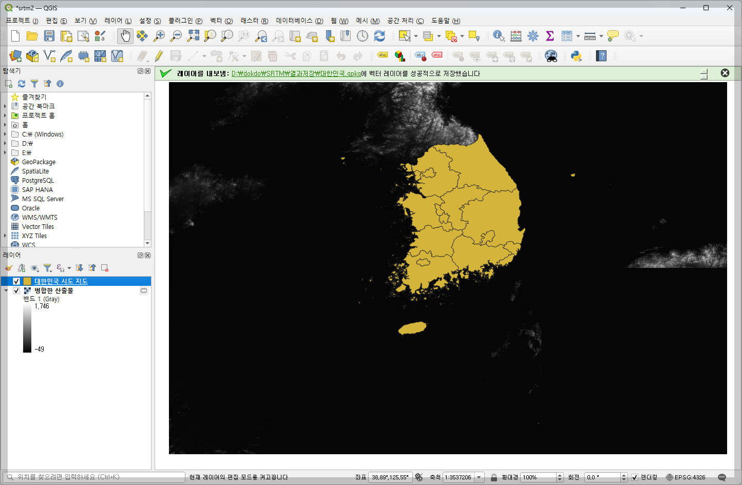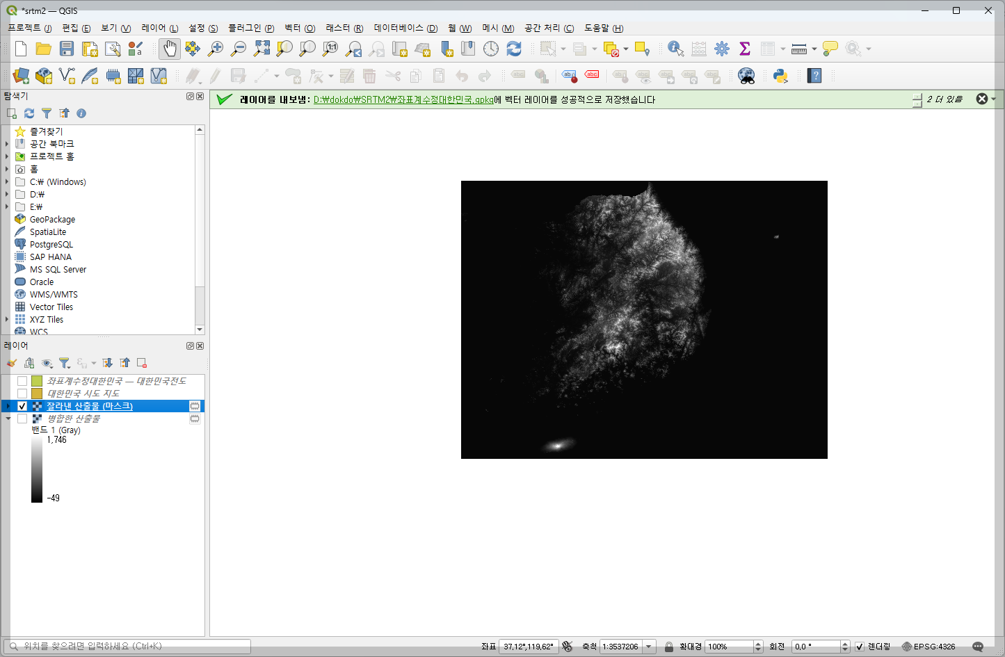 병합된 레스터 레이어를 필요한 부분만 잘라 추출하기 위해서는 벡터레이어로 마스크를 씌어야 합니다. 대한민국 전도 벡터 레이어를 위에 올려 거기에 맞춰 병합된 레스터 레이어의 필요 부분만 잘라냈습니다.