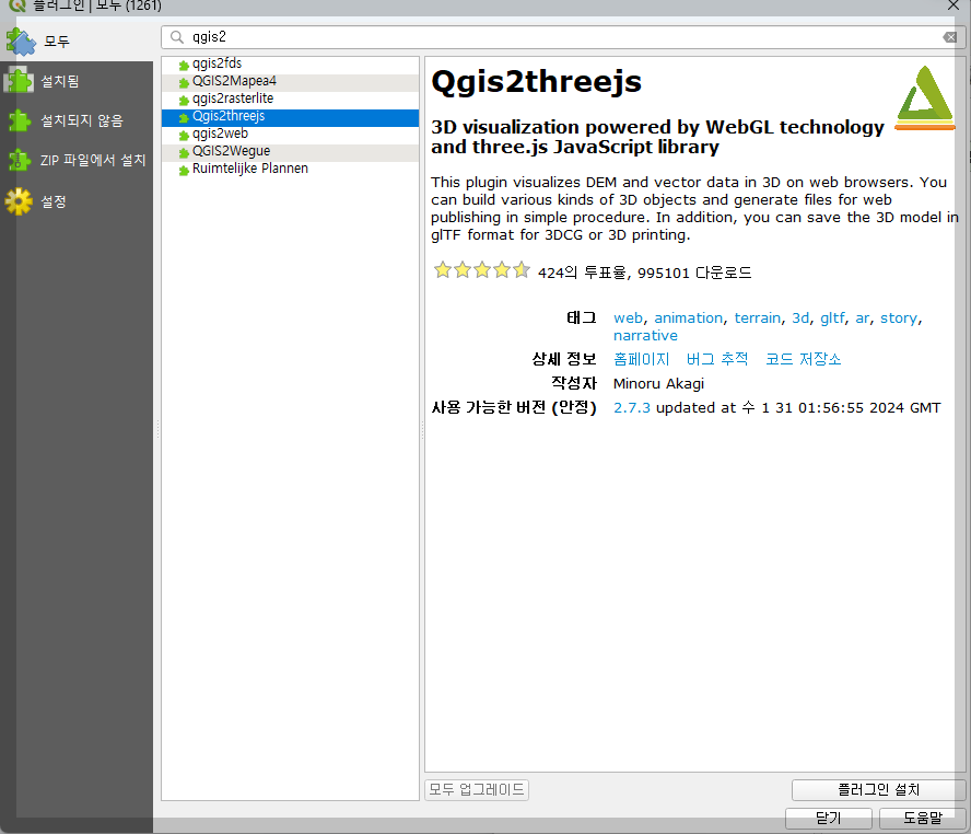3D 결과물로 보기 위해서는 Qgis2threejs 플러그인 설치가 필요합니다.