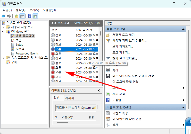 - 목록에서 오류(빨간색 느낌표) 항목을 찾아 설치 프로그램과 관련된 오류 메시지를 확인합니다.