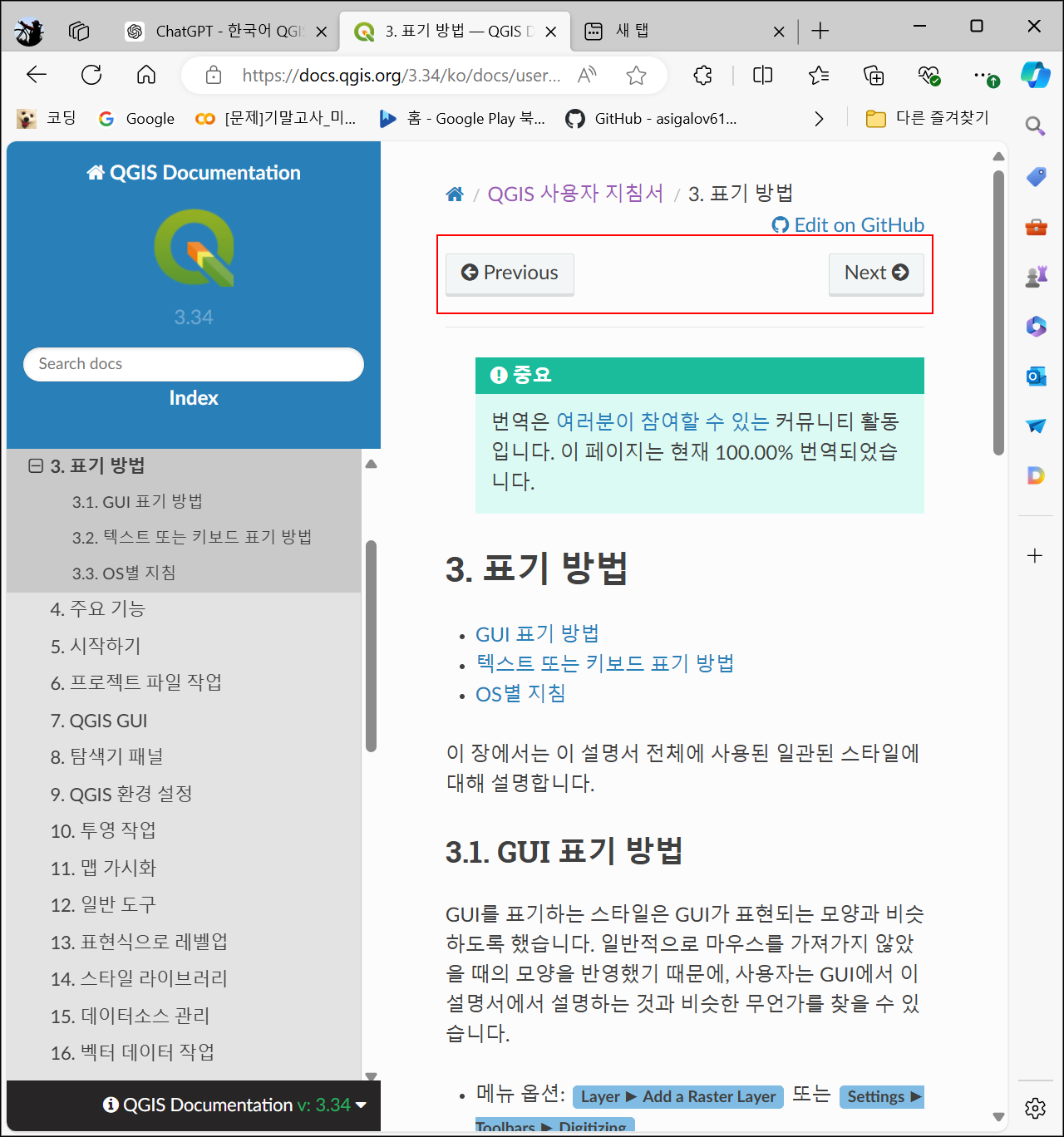 지리정보시스템 중 오픈소스인 QGIS는 뛰어난 기능과 높은 활용도를 자랑하지만 일반인이 사용하기에는 쉽지 않습니다. QGIS는 자세한 지침서를 제공하고 있습니다. 지침서의 주소는 docs.qgis.org로서 버전별로 제공됩니다. 아래에 올린 캡처는 최신 LTR 버전으로 QGIS 3.34 버전의 사용자 지침서 시작 화면입니다.