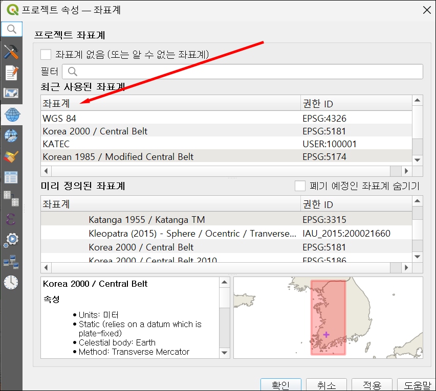- 메뉴에서 프로젝트(Project) > 프로젝트 속성(Properties) > CRS 탭을 선택합니다.