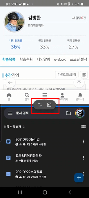 이 아이콘을 선택하면 화면을 둘로 나누어서 학습하면서 구글문서에 필기를 할 수 있습니다. 저는 [교육&영어영문학과]라는 문서를 만들어 계속 업데이트하면서 학습노트를 구성하고 있습니다. 물론 이 방법은 수면을 취하기 전에도 가능한 방법입니다. 제가 일찍이 가장 게으른 학습법으로 포스팅한 것이 있습니다.