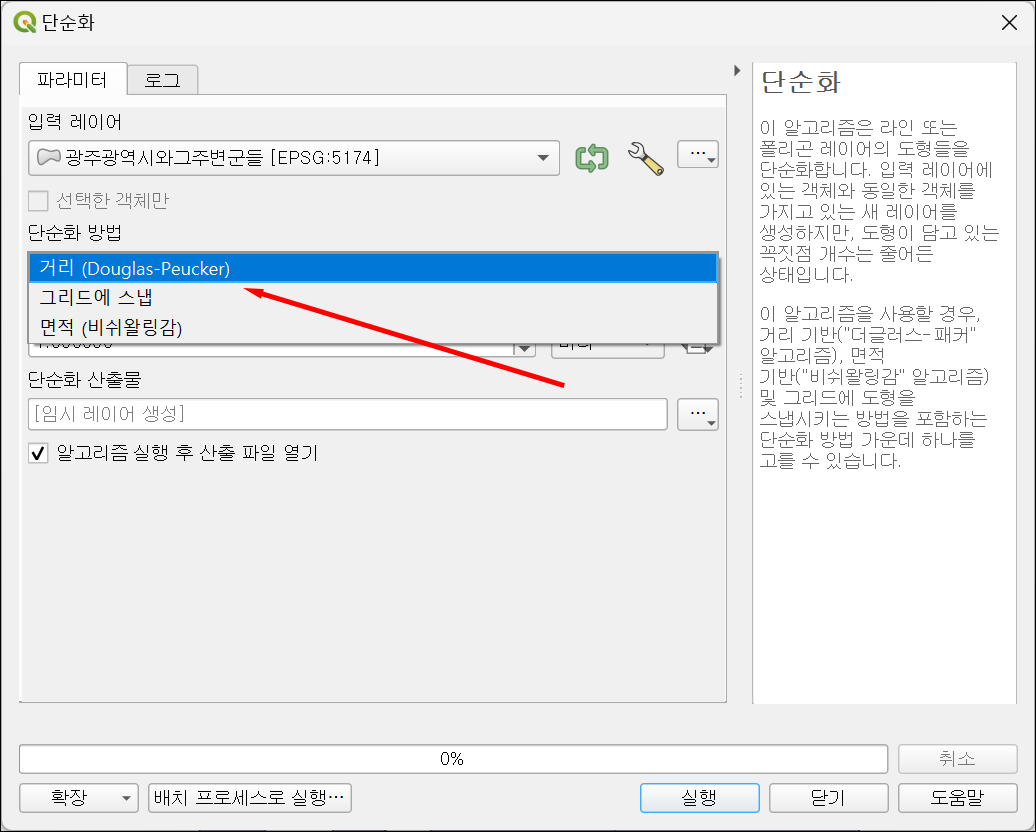 - 기법(Method): 단순화 기법을 선택할 수 있습니다. 예를 들어, Douglas-Peucker 알고리즘을 사용할 수 있습니다. 이 기법은 도형을 단순화하는 데 자주 사용되는 알고리즘입니다.