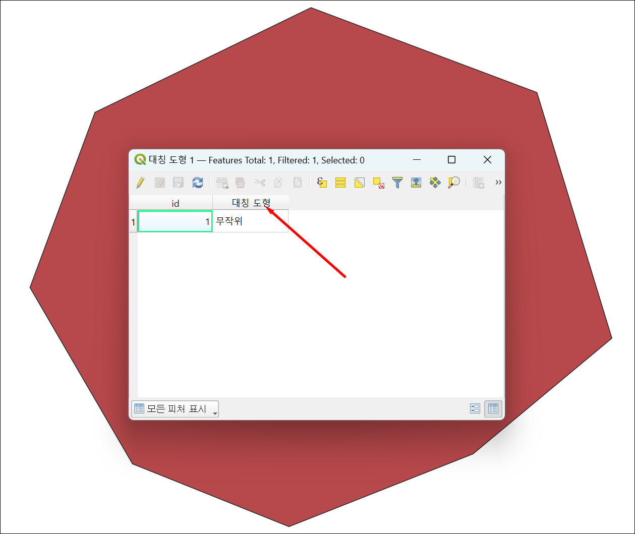 QGIS에서 필드명을 변경하려는 벡터 레이어를 선택합니다. 레이어 패널에서 해당 레이어를 클릭합니다. 레이어에서 필드명이 '대칭 도형'으로 되어 있는데, 필드명을 '도형'으로 변경하고자 합니다.