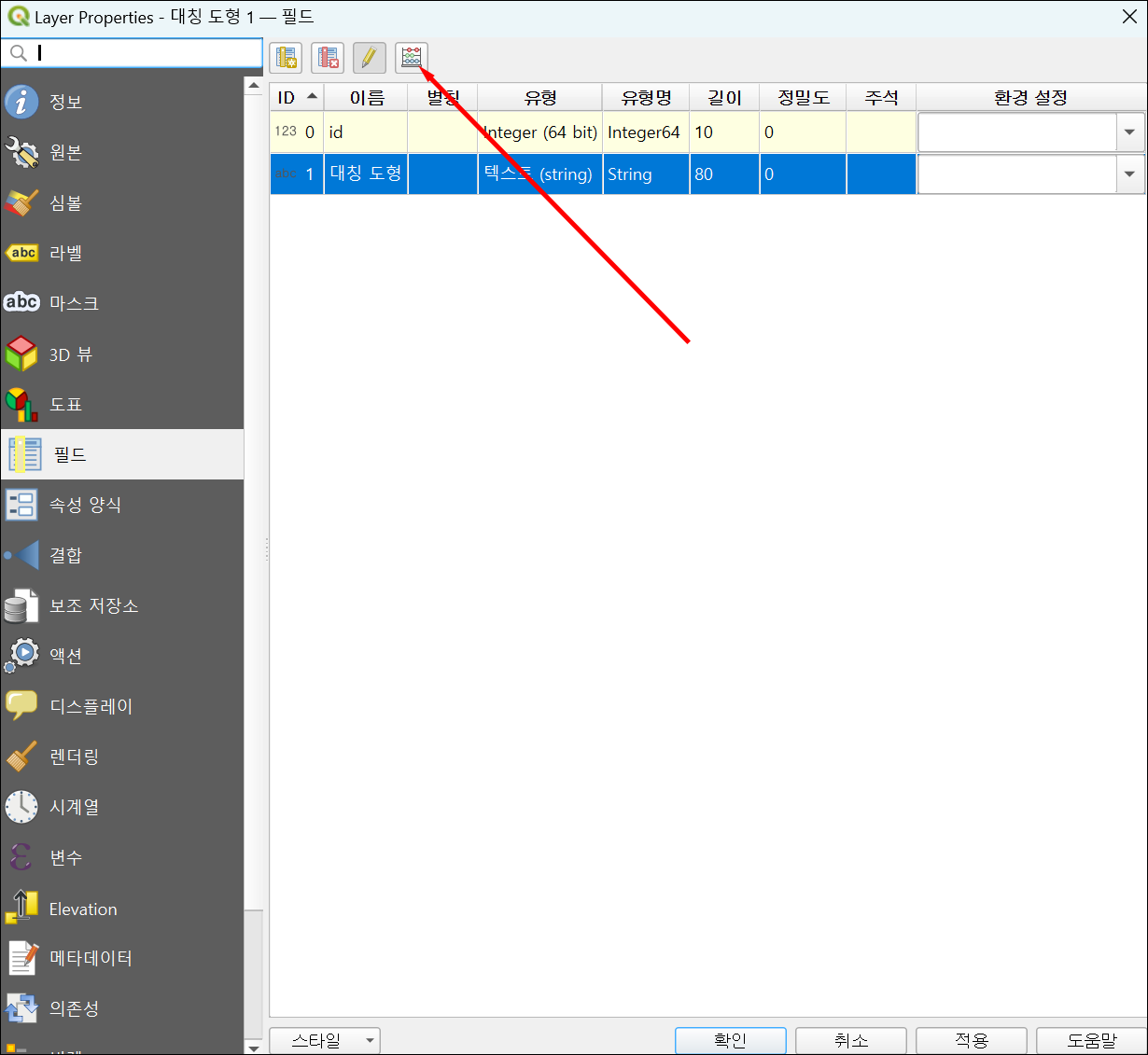 선택한 벡터 레이어에서 마우스 오른쪽 버튼을 클릭하고, '속성'을 선택합니다. 왼편 메뉴 중에서 '필드'를 선택합니다.
