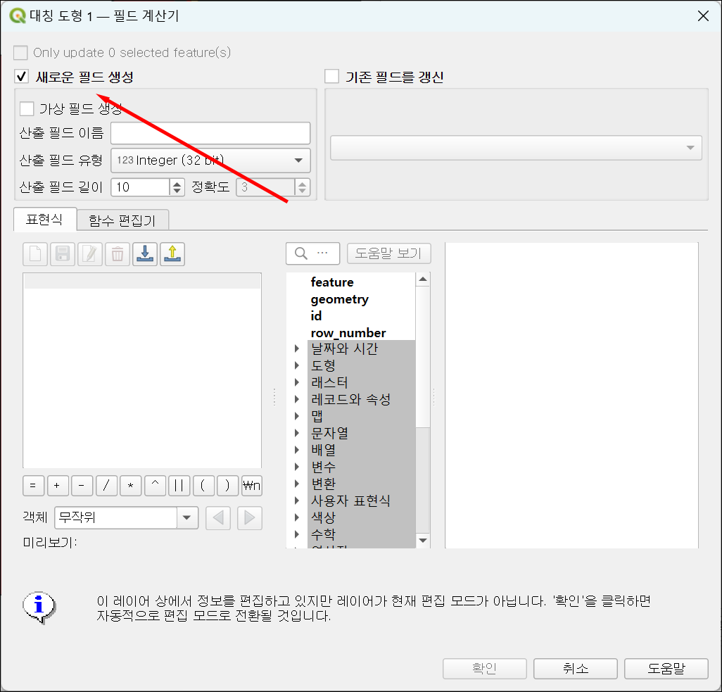 필드 계산기 창이 열리면, '새로운 필드 생성' 옵션을 선택합니다. 새 필드 이름에 원하는 새로운 필드명(여기서는 '도형)을 입력합니다.