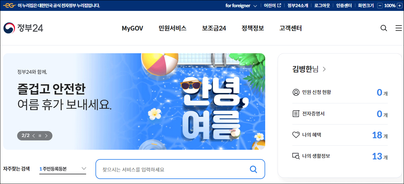 '정부24'의 초기 화면입니다. 로그인을 하면 자신과 직접 관련된 내용이 오른쪽에 항목별로 떠오릅니다. 미처 확인하지 못했던 혜택들도 알아볼 수 있습니다.