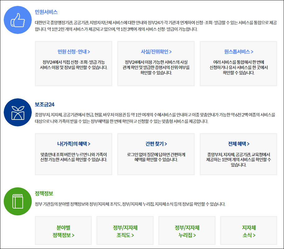 - 민원 신청ㆍ안내: 정부24에서 직접 신청, 조회, 발급이 가능한 서비스 이용 정보 제공.