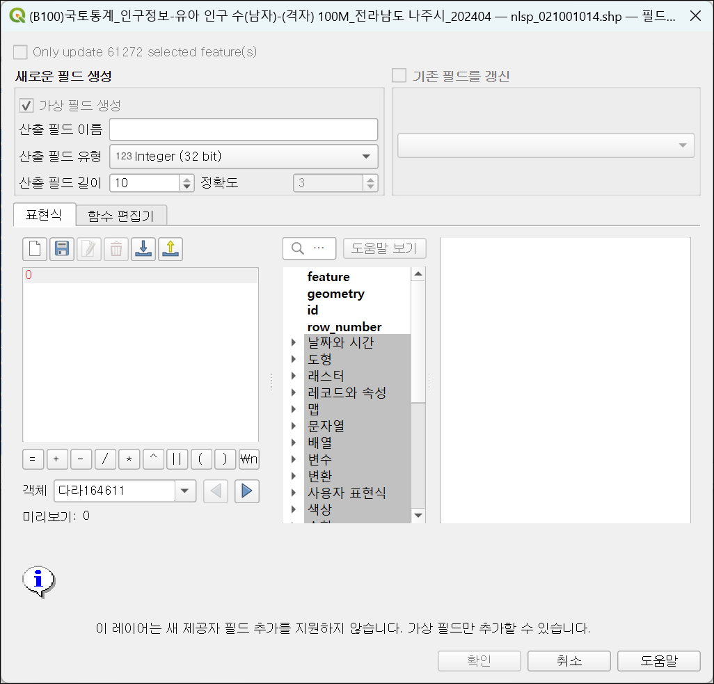 nlsp_021001014.shp - 이 레이어는 새 제공자 필드 추가를 지원하지 않으며, 가상 필드만 추가할 수 있습니다.