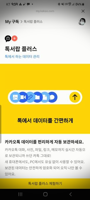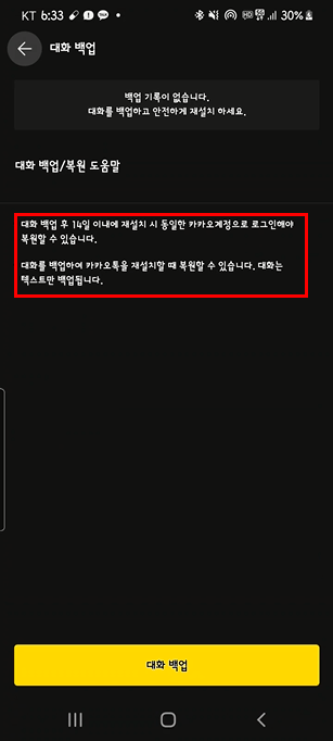 대화를 백업하여 카카오톡을 재설치할 때 복원할 수 있습니다. [대화 백업]은 텍스트만 백업됩니다. 미디어까지 백업하고자 할 때는 [톡서랍 플러스]를 구입해야 합니다.