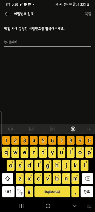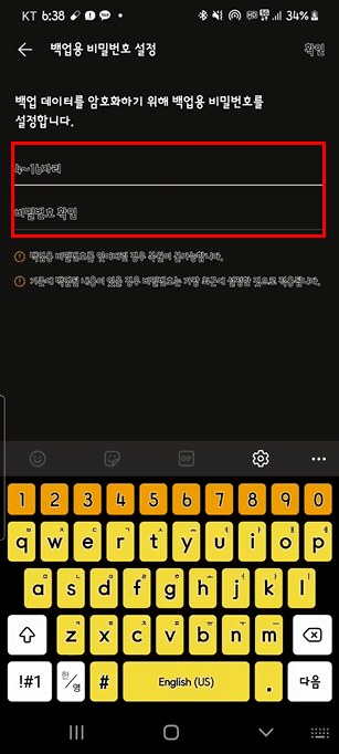 [대화 백업]을 선택하면 비밀번호 설정을 요구합니다. 이 비밀번호는 복원하고자 할 때 요구되는 비밀번호입니다.