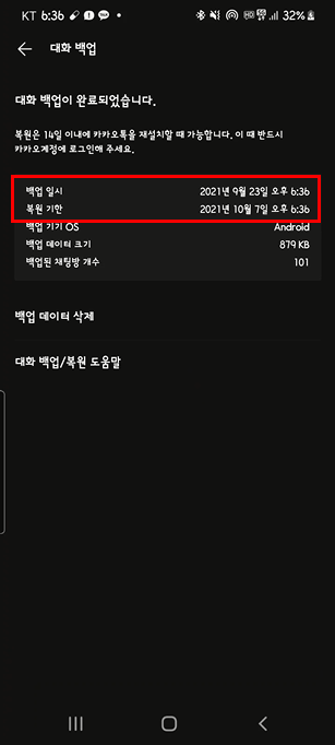 백업을 하면 그 결과가 다음과 같이 보고서로 출력됩니다. 백업 일시와 복원 기한이 표시됩니다. 백업한 데이터 크기와 백업된 채팅방 개수 등이 나옵니다.