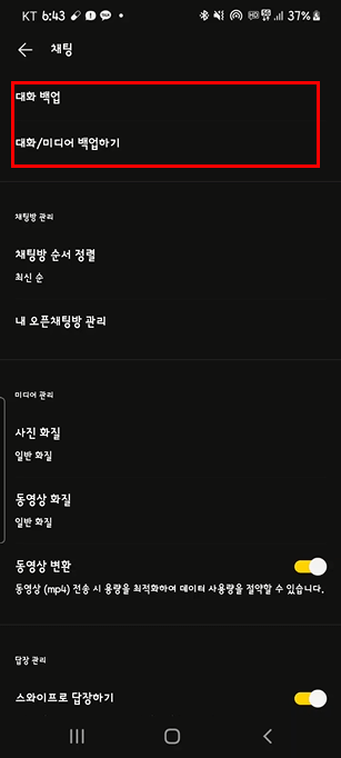 설정 중 채팅 | 채팅 설정에서 대화 백업과 대화/미디어 백업 |