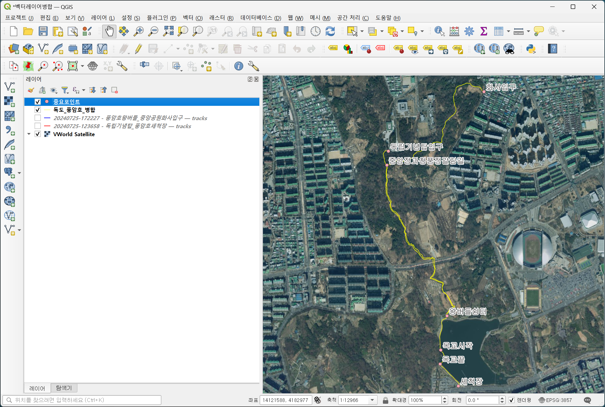 측정이 완료되면 QGIS 화면 하단에 측정된 거리가 표시됩니다.