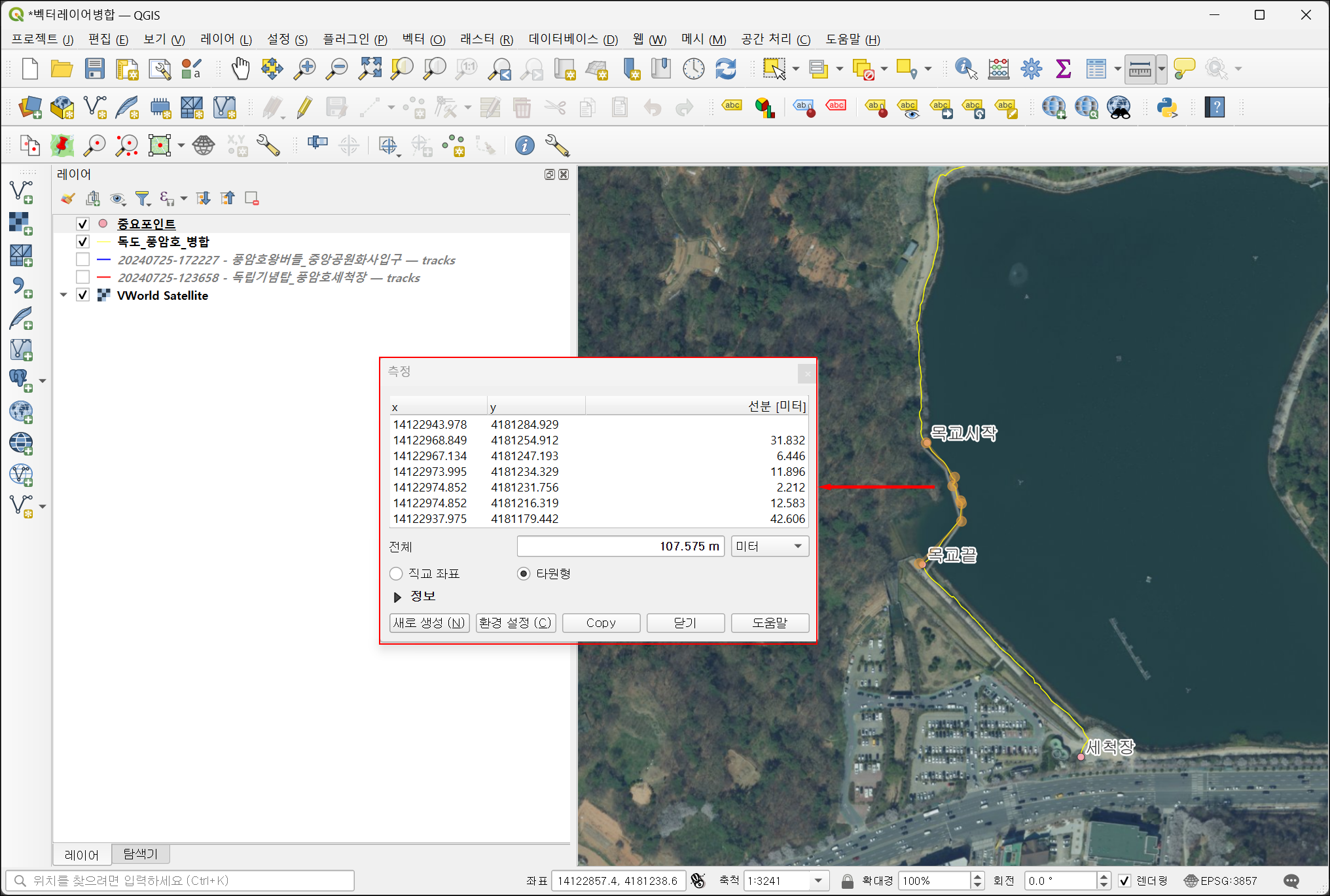 위의 방법으로 '목교시작'부터 '목교끝'까지의 거리를 측정할 수 있습니다. 측정된 결과는 107.6미터였습니다.