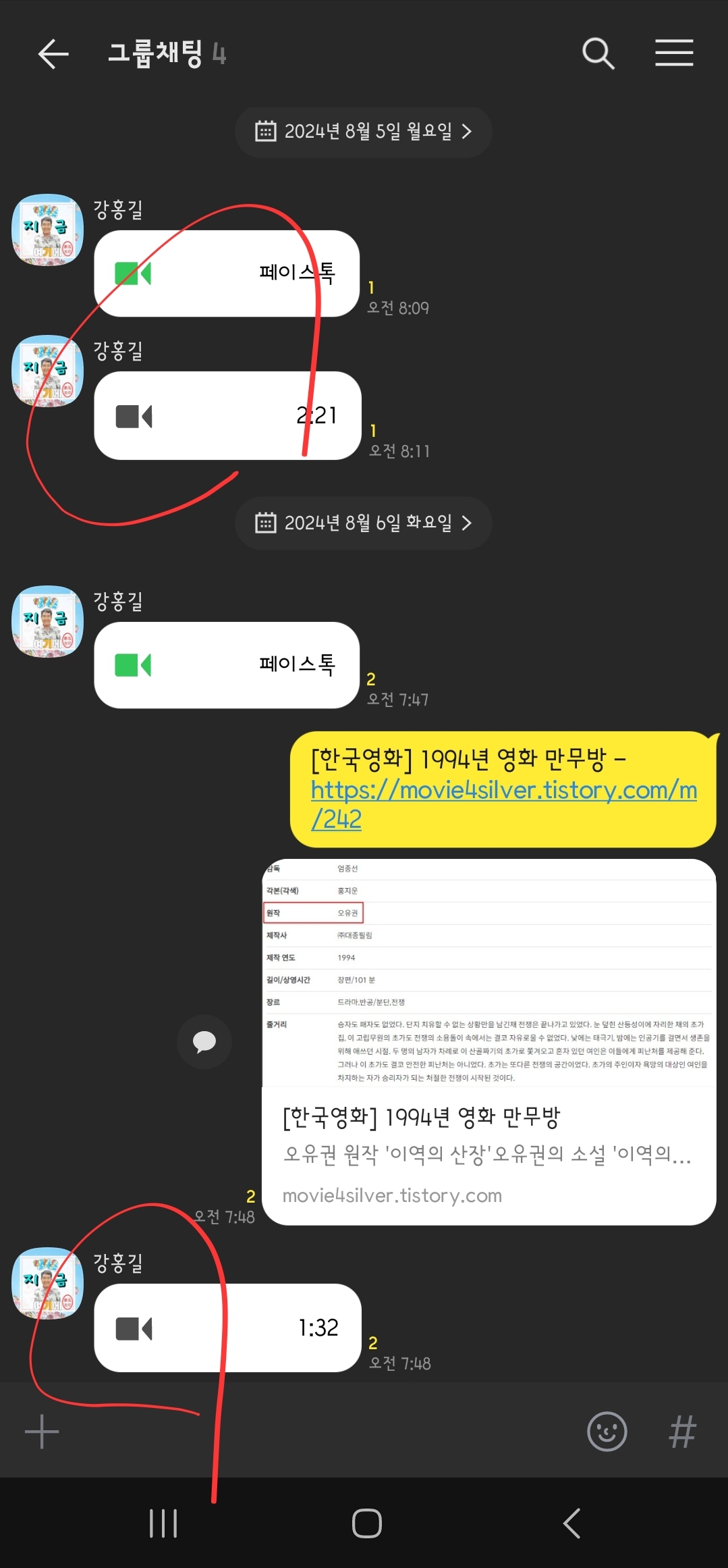 페이스톡 중에 보낸 메시지는 그 사이에 위치합니다. 페이스톡 시작과 종료를 알리는 아이콘이 대부분 정답게 있기 때문에 어리둥절하지만 위 그림처럼 둘 사이가 벌어져 있고, 그 안에 이벤트가 기록되어 있는 것을 보면 이해가 될 것입니다.