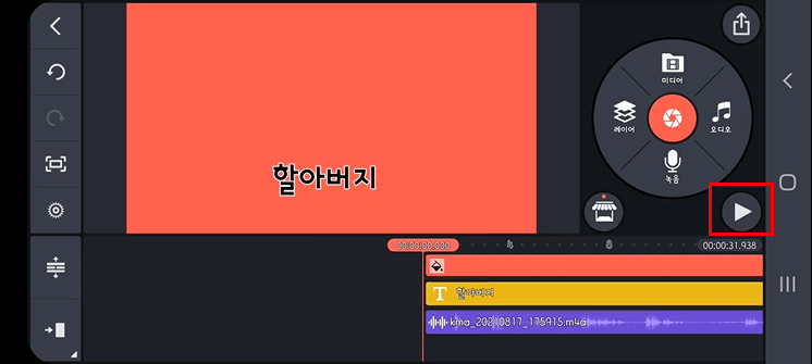 이제 녹음된 내용을 들으면서 텍스트클립을 잘라내며 자막을 편집합니다. 플레이하는 버튼은 오른쪽 아래에 삼각 표시입니다. 첫번째 '할아버지' 음성이 끝나는 부분에서 멈춥니다.