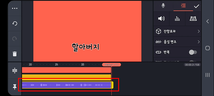 키네마스터에서 직접 녹음할 때 주의할 일은 항상 메인레이어 기준으로 마감된다는 사실입니다. 만약 녹음 내용이 길어지면 위 경우에는 메인레이어가 끝나는 30초 근처에서 멈추게 됩니다. 물론 다른 곳에서 녹음한 파일을 끌어다 레이어에 배치한다면 그런 한계는 벗어날 수 있습니다. 여기에 메인볼륨을 조절할 수도 있고, 효과나 상세볼륨 조절도 가능합니다.
