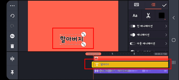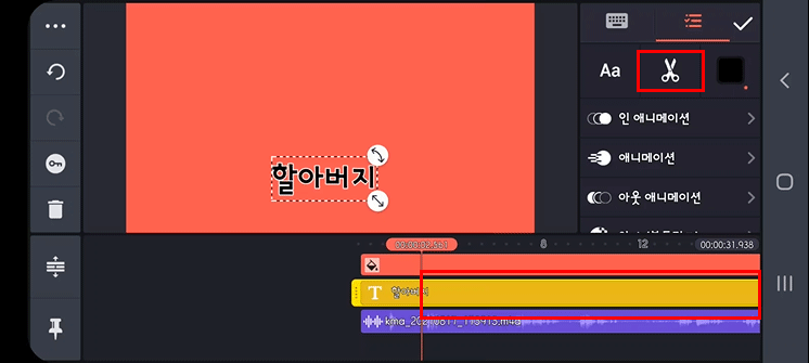 할아버지 음성이 끝나는 부분에서 멈추고 텍스트클립을 선택합니다.