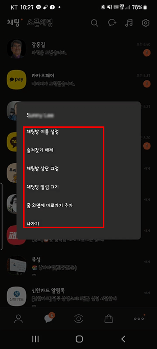 개인의 경우도 마찬가지입니다. 채팅중인 친구 프로필을 꾹 누르면(롱태그) 팝업창이 나오고 거기서 요구하는 사항을 선택하면 됩니다. 채팅방을 나갈 수도 있고 상단에 고정할 수도 있습니다.