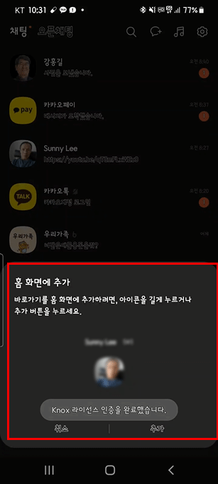 심지어 홈화면에 바로가기 추가도 가능합니다. 저는 친구 한사람을 홈화면에 바로가기로 추가하도록 하겠습니다.