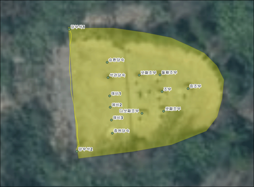 개인정보라서 다 밝히기는 어렵습니다. 스마트폰의 GPS Logger를 이용해서 경계값을 구하고 QGIS를 이용해서 관련된 데이터를 구했습니다. 현재 들어선 산소는 9구인데, 앞으로 들어올 수 있는 위치를 찍어봤습니다.