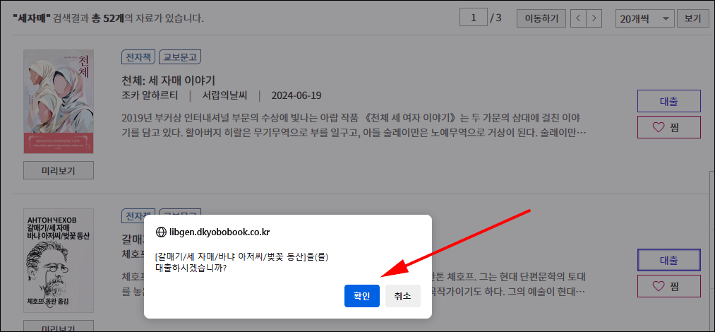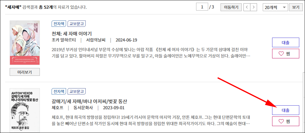이용할 도서를 검색했습니다. 체호프의 희곡 '세 자매'를 검색했더니, 무려 52권이 검색됐습니다. 전자책이 대세로 굳혀가는 느낌입니다. 이중 두 번째가 제가 원하는 도서군요.