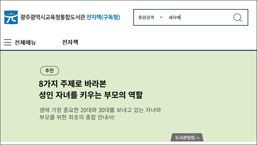 전자책을 대출하기 위해서는 이용하는 도서관에서 제공하는 서비스를 타고 협업이 이루어지는 전자책 구독 사이트로 이동해야 합니다. 제 경우는 광주광역시 교육청통합도서관 홈페이지를 통해 '구독형 전자책'을 대출할 수 있는 교보문고 전자책 서비스로 들어왔습니다.