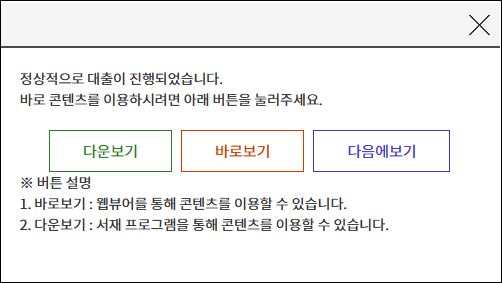 콘텐츠 대출이 정상적으로 완료되었음을 알리는 메시지와 함께, 사용자가 선택할 수 있는 세 가지 버튼을 제공하고 있습니다. 세 방법의 차이는 다음과 같습니다.