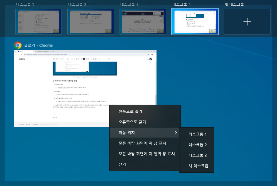- 우클릭 메뉴에서 "다른 데스크톱으로 이동" 옵션을 선택한 후, 이동할 데스크톱을 지정합니다.