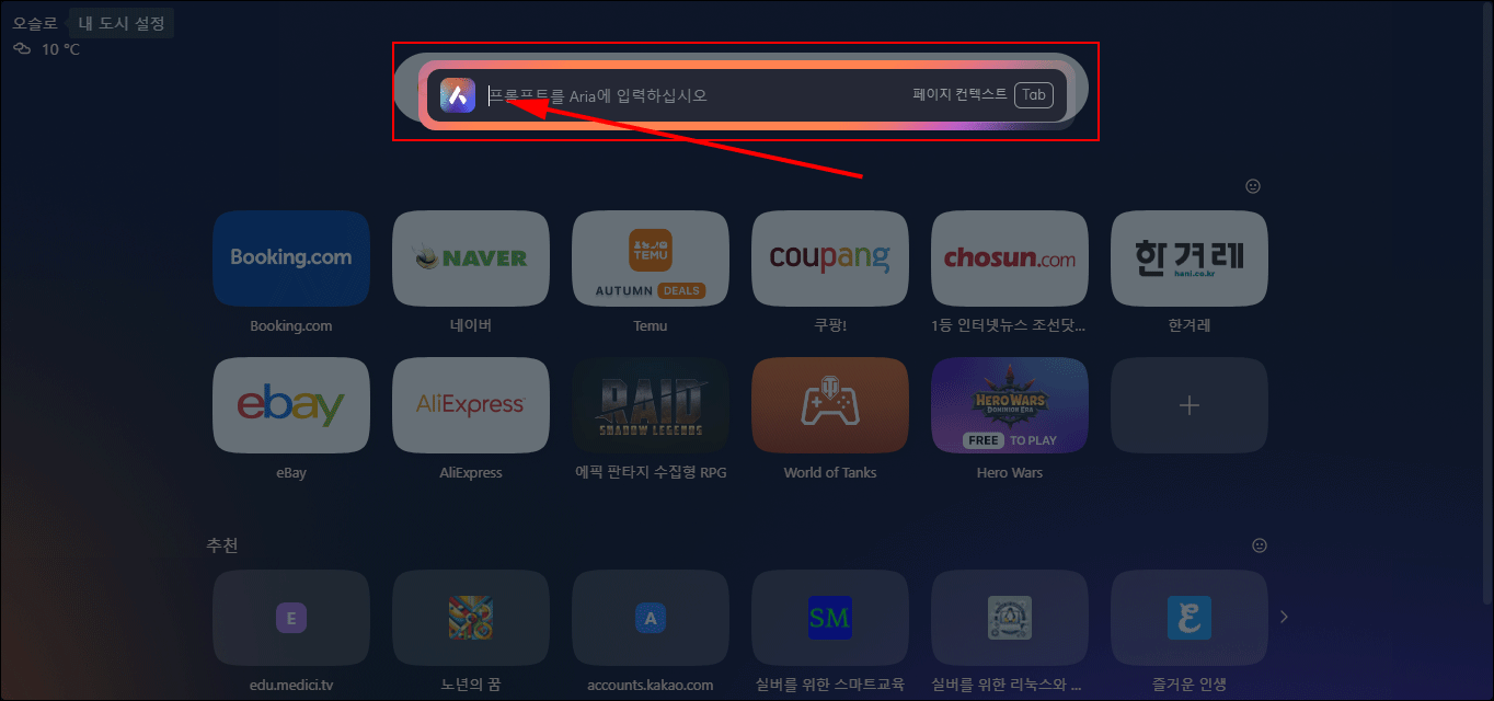 아직 세련된 수준은 아니지만 별 절차를 거치지 않고 브라우징 중에 바로 인공지능을 사용할 수 있다는 장점이 있습니다. 따로 '아리아' 대화창을 불러 이용할 수도 있고, 검색 박스에서 단축키 'Ctrl + /'로 인공지능 '아리아'를 불러올 수도 있습니다.