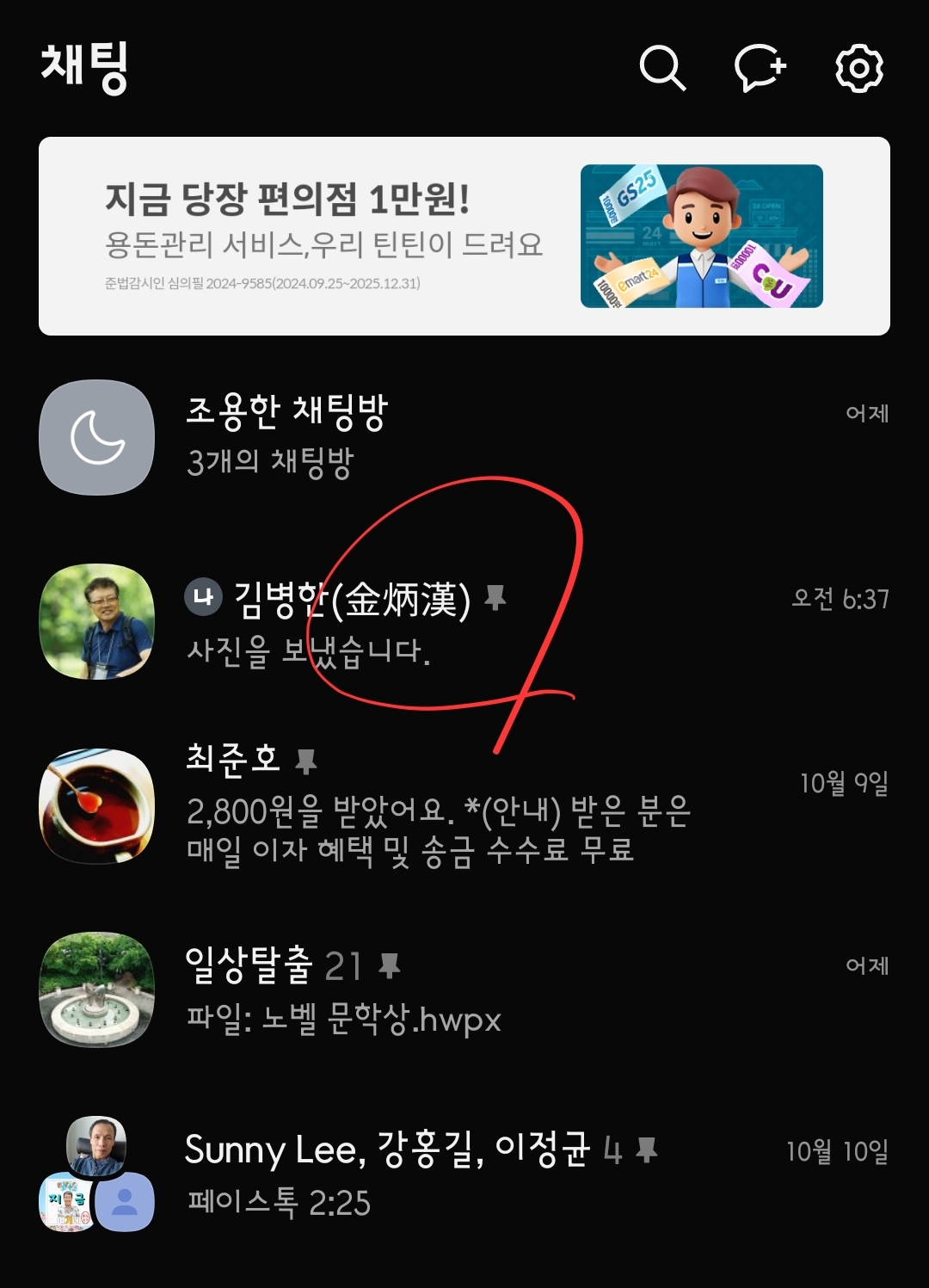 방법은 상단에 고정하는 것입니다. 고정된 대화방은 게시판에 핀이 꼽혀 있습니다.