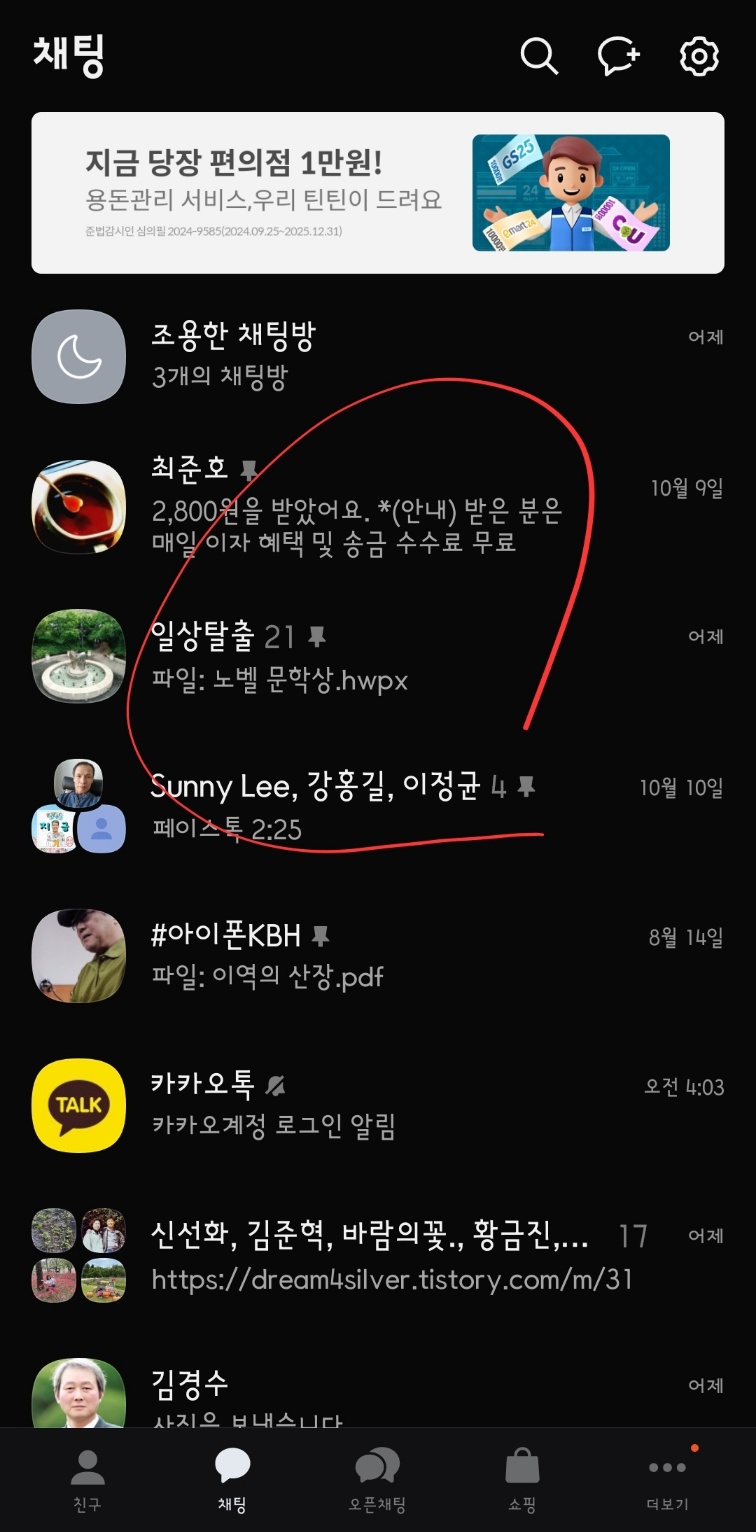중요한 대화방 리스트를 길게 누릅니다. 나타난 팝업 메뉴에서 '채팅방 상단 고정'을 선택합니다.