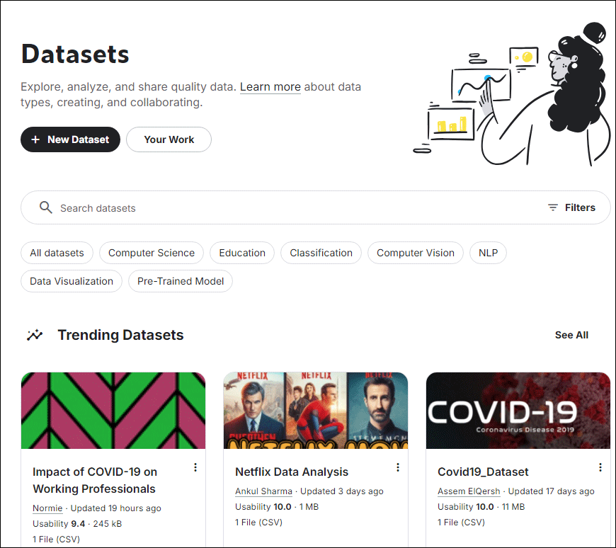 데이터 세트는 Kaggle에서 제공하는 또 다른 중요한 자원입니다. 다양한 분야의 데이터를 무료로 제공하여, 학습자들이 실습을 통해 분석 기술을 익히고 모델을 실험할 수 있습니다. 이러한 데이터는 경제, 사회, 건강 등 여러 주제를 다루며 실제 데이터 기반의 학습을 돕습니다.