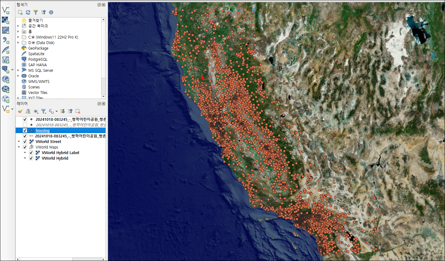 캐글은 세계 곳곳에서 발생하는 데이터를 공개하고 이와 관련한 문제를 해결하는 플랫폼입니다. 다음은 Kaggle에서 제공한 데이터세트 중 캘리포니아 주택 거래 정보를 받았습니다. 받은 데이터세트를 QGIS에서 불러들인 결과입니다.