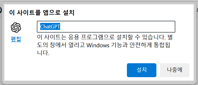 그 옵션을 선택하면 아래와 같은 대화창이 뜬다. 아래는 오픈에이아이의 '챗봇' 사이트를 앱으로 만드는 과정이다. '설치'를 눌러 앱을 생성한다.