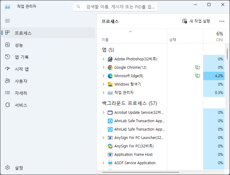 - Ctrl + Shift + Esc를 눌러 작업 관리자를 엽니다.